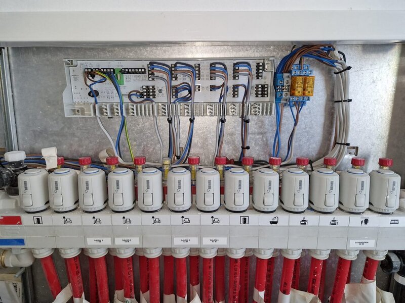 Instalación del sistema de aerotermia y suelo radiante: Se instalaron las unidades exteriores, el grupo hidráulico, el depósito de ACS y toda la red de tuberías del suelo radiante con sus correspondientes colectores.